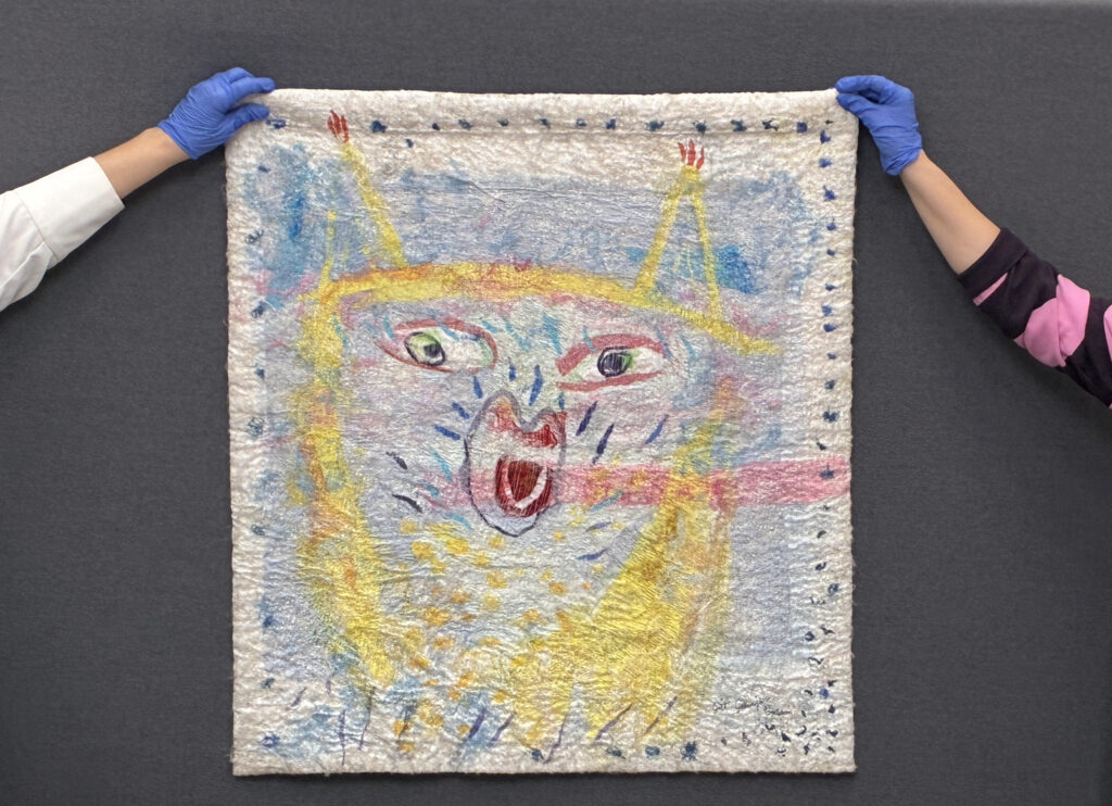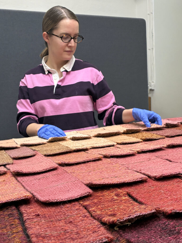 Intendent Jennie Idoffsson packar upp konstverket Tak av Maria Wahlberg.