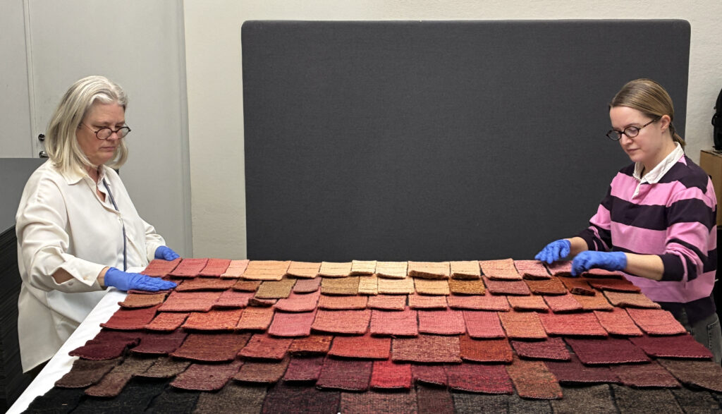 Intendenterna Anneli Adamsson och Jennie Idoffsson packar upp konstverket Tak av Maria Wahlberg.